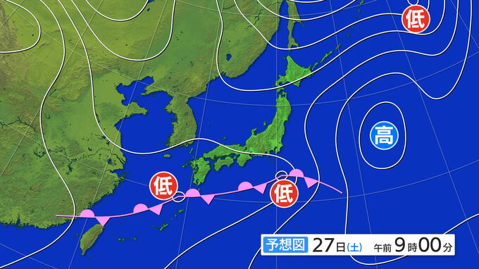 27日午前9時の予想天気図ですが、東シナ海から関東の南海上には前線が東西に長くかかっています。ただ、これまでの予測より西日本では前線の位置が南に移っています。