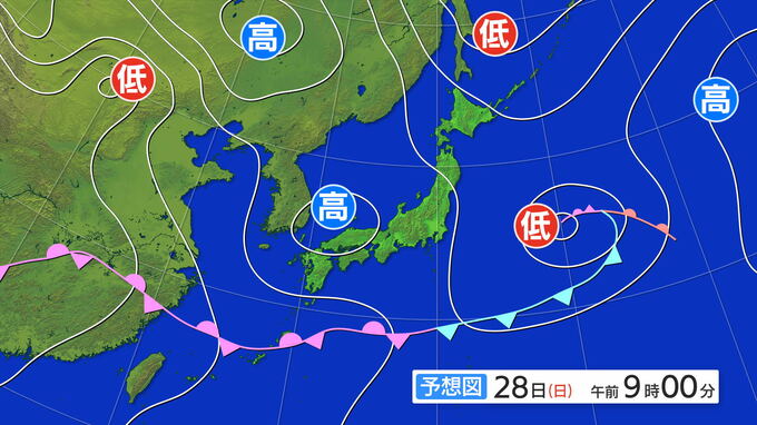 28日日曜日は、山陰沖に中心を持つ高気圧の影響で九州から東北の広い範囲で晴れる見込みです。