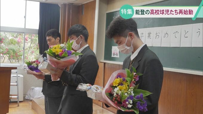 3月1日の卒業式には、卒業生を送り出そうと野球部員が集まりました。元日の地震以降、みんなが顔を合わせるのは2か月ぶりです。