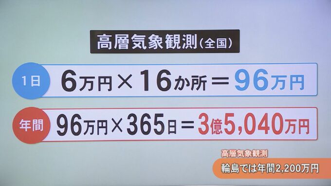 復活はいつ? 被災地の気象情報のカギ握る”高層気象観測” 気象予報士のぼやき 2024年5月3日(金) 08:00 石川 ゴム気球を1回飛ばすのにかかる費用はおよそ3万円で、1日2回なので1日では3万円×2=6万円、年間ではおよそ2200万円です。 ちなみに、全国16か所で行われれば1日およそ100万円、年間でおよそ3億5000万円です。