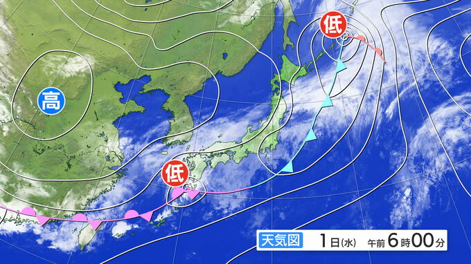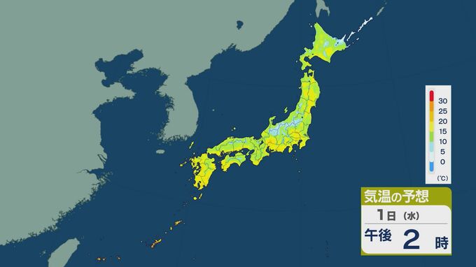 1日水曜日は、日本の南海上に伸びる前線などの影響で、西日本から東日本の広い範囲ですっきりしない天気になる見込みです。一方で、日中の気温は上がらないところもありそうです。