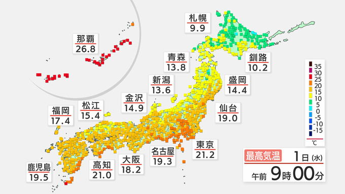 1日午前9時時点、けさの最高気温ですが、東京では21.2度を午前8時26分に観測しています。しかし、日中の予想最高気温は19度で、朝のほうが気温が高い一日になりそうです。