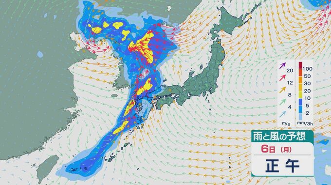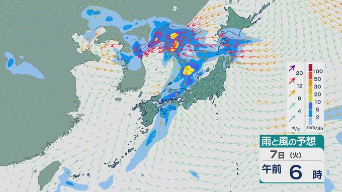 【画像】7日(火)正午まで 3時間ごとの雨と風の予想