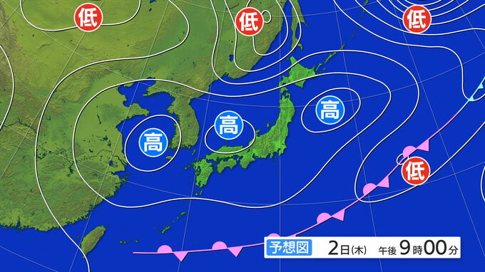 2日木曜日は西から高気圧に覆われ広く晴れるでしょう。3日金曜日も晴れるところが多く、ゴールデンウィーク後半のスタートは天気に恵まれそうです。4日土曜日は気温が高く、夏日になるところもあるでしょう。熱中症対策などを心がけてください。