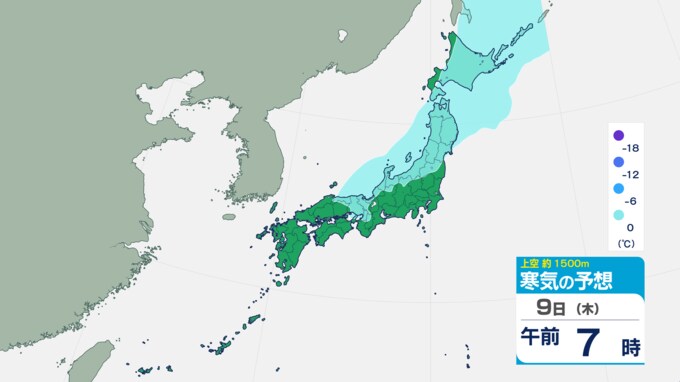 9日午前7時の上空およそ1500メートルの寒気の予想ですが、近畿から北陸、東北や北海道にかけて0度以下の範囲になっています。これらの地域ではまだひんやりした状態が続きそうです。