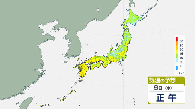 一方、9日は関東の南東海上には低気圧があり、関東ではくもりや雨の天気になりそうです。寒気の影響はありそうですが、日照がないこともあり気温はそれほど高くなく、東京の最低気温は12度、最高気温は20度の見込みです。