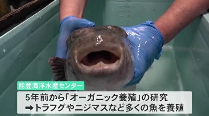 能登町越坂にある金沢大学の研究施設「能登海洋水産センター」では、5年前から食の安全性向上を目的として「オーガニック養殖」の研究を行っていて、高級魚として知られるトラフグをはじめニジマスやヒラメなど多くの魚を養殖しています。