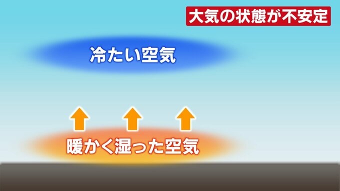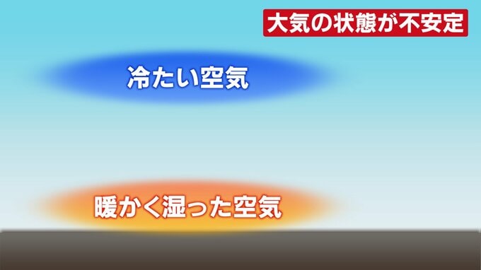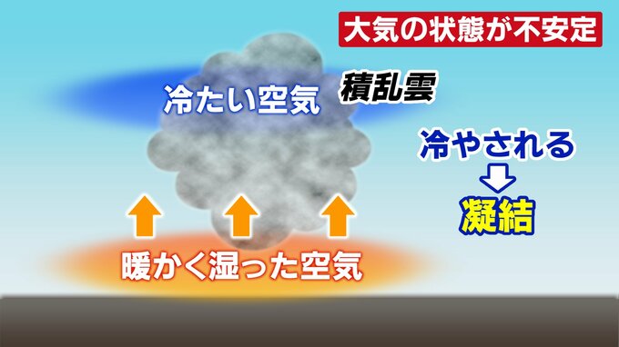 天気予報でおなじみの「大気の状態が不安定」 つまりはどういうこと? 梅雨の今起こりやすい現象をわかりやすく 2024年6月29日(土) 08:10 石川 たとえば、この時期は梅雨前線によって雨が降ることが多いですが、この前線を堺におおむね北側は冷たい空気、南側は暖かい空気、湿っていたりもしますが、この2つがぶつかり合う状態になります。ぶつかり合うから前線ができるともいえます。 北は「冷たく」南は「暖かく」 お互いの空気がぶつかり前線ができ特に南側で雲が発達する 前線に近いところなどのイメージですが、下に暖かく湿った空気、上に冷たい空気が流れ込む状態になります。 これが「不安定な状態」です。 暖かい空気は軽いので、上空に上がろうとします。 そして、冷たい上の空気に触れると、空気中に含まれる水蒸気が凝結をして水滴になり、それが雲の発生につながります。