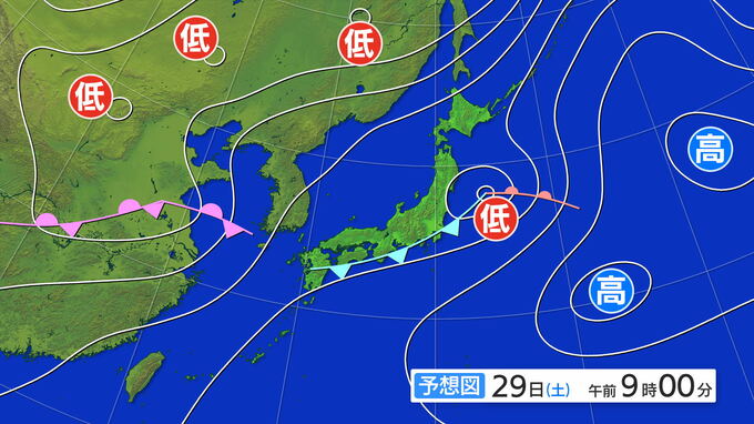 29日(土)午前9時の予想天気図です。前線は九州から四国、関東の南岸にかけて伸びる見込みです。