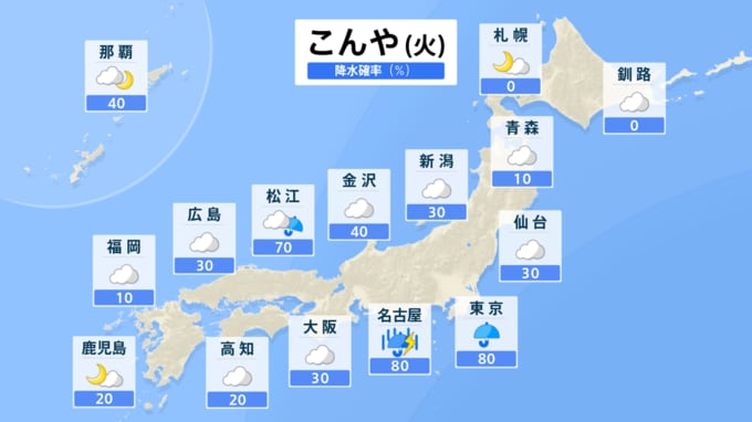 未明は東海で、17日(水)の朝は北陸で前線に向かって暖かく湿った空気が流れ込み、大気の状態が不安定になり雨が強まるでしょう。