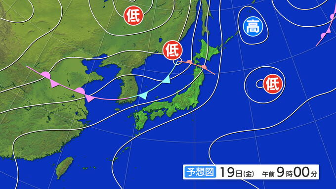 19日午後9時の予想天気図ですが、低気圧が北日本の日本海にあって前線をともなっています。低気圧は北よりに進む見込みで、前線の影響を受け、北日本の日本海側や北陸では雨が降るでしょう。