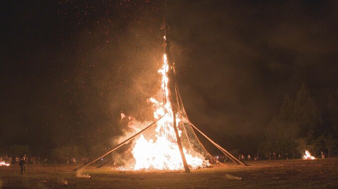 地震の影響で一時、賛否が分かれましたが多数決で開催が決まり、夜空に燃え上がる大松明に観客から歓声が上がりました。