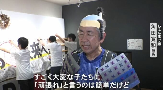 元気な笑顔があふれるのは、名物サポーター「ちょんまげ隊長ツンさん」こと角田寛和さんと能登半島地震で被災した5人の中学生。