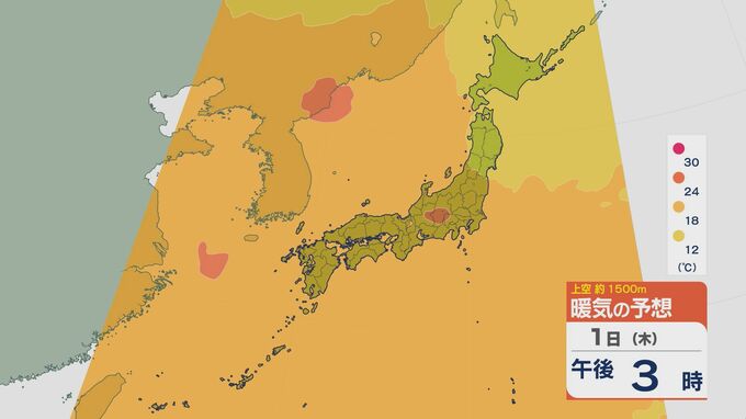 西日本から東日本は晴天の一日に 北陸でもようやく梅雨明けに 猛暑日は続出で熱中症に警戒を 暖気の予想シミュレーション 2024年8月1日(木) 09:47 石川 一方で、日差しが降り注ぎ日中の気温はかなり高くなるところが多いでしょう。午前9時半の時点で太平洋側を中心にすでに30度を超えています。 1日の上空およそ1500メートルの暖気の予想ですが、日本列島のほとんどが18度以上の範囲に覆われていて、長野県など内陸部では24度以上になる見込みです。