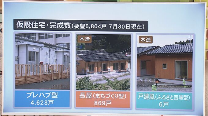 7月30日現在、石川県内では仮設住宅を6804戸建設する予定で、そのうちプレハブ型は4623戸、木造長屋型は869戸完成しています。