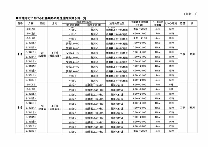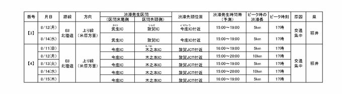 このため、日中には渋滞が発生する見込みで、新潟方面に向かう下り線では10日から16日にかけて、米原方面に向かう上り線では11日から15日にかけて最大10キロの渋滞が予想されます。