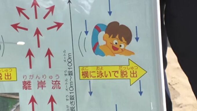 海上保安部は離岸流に巻き込まれたときは岸と平行に泳ぎ、流れから脱出してから岸に向かうなど落ち着いて対処するよう呼びかけています。