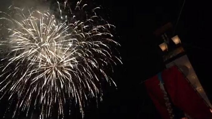 花火が打ち上げられる中、高さ15メートルの巨大キリコが乱舞します。