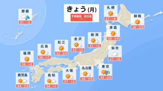一方、大阪では予想最高気温が37度など、猛暑日のところもありそうです。まだまだ、熱中症など暑さ対策が必要なようです。