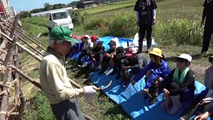 厳しい残暑の中、子どもたちは黄金色に染まった田んぼで、泥だらけになりながらカマで稲を刈り取り、稲を乾燥させるためのハサ干し作業を行いました。