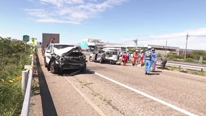 警察によりますと、乗用車が前を走っていたライトバンに追突し、さらに、ライトバンがトラックに衝突したとみられています。