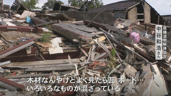 「この山になったものを分別しないといけない。木材なんやけどよく見たら瓦、ボード、紙、綿…いろんなものが混ざっている。これを分けるのがものすごく大変で。」