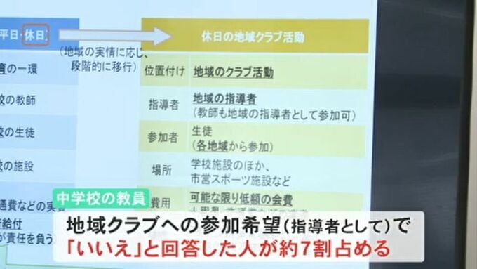 また、中学校の教員に地域クラブへ指導者としての参加希望を聞いたアンケートでは、「いいえ」と回答した人が7割を占めたということです。