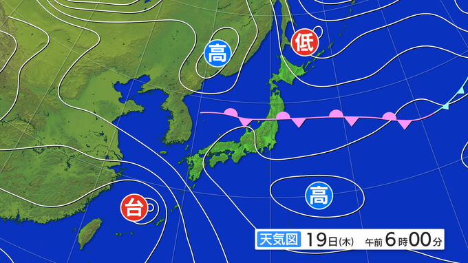 19日午前6時の天気図です。日本海から東北、そして日本の東の海上に前線がのびています。