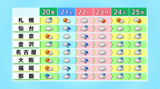 22日(日)以降は太平洋側でも、九州から東北の広い範囲で雨が強まりそうです。