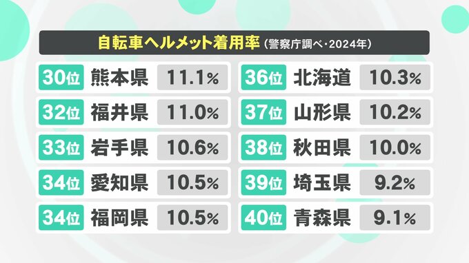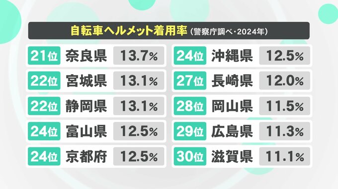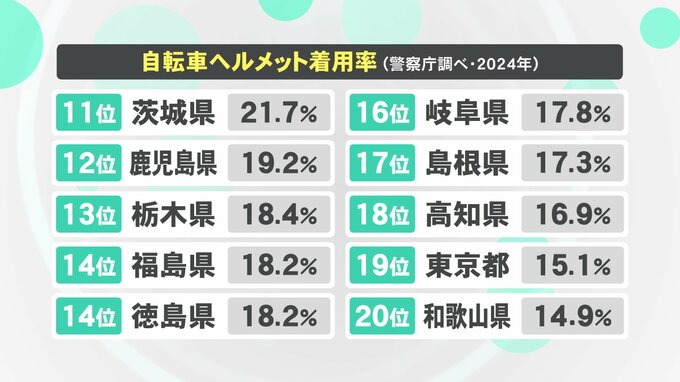 着用率の調査は今年7月1日から19日の平日に全国で行われ、駐輪場が整備された駅の周辺や商店街又はショッピングセンターの周辺で調査されました。その結果、全国平均は17.0%で前の年より3.5ポイント増加しました。