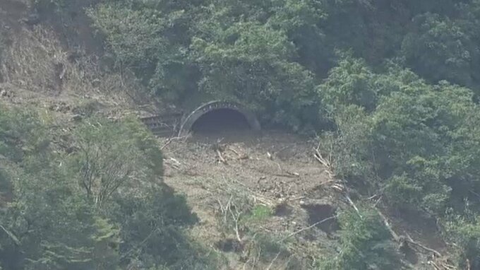 ヘリコプターからのリポート「輪島市の中屋トンネル付近、国道249号を撮影しています。辺り一帯が土砂崩れが起きています」