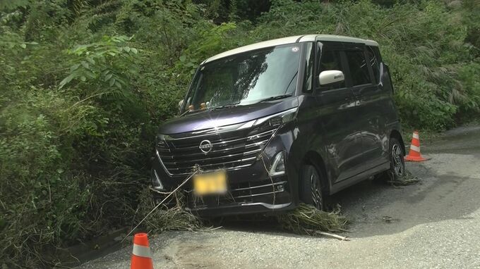 能登町久田の川沿いで側溝に脱輪した1台の軽乗用車。タイヤには草が絡みついていて、水に浸かっていたことがわかります。