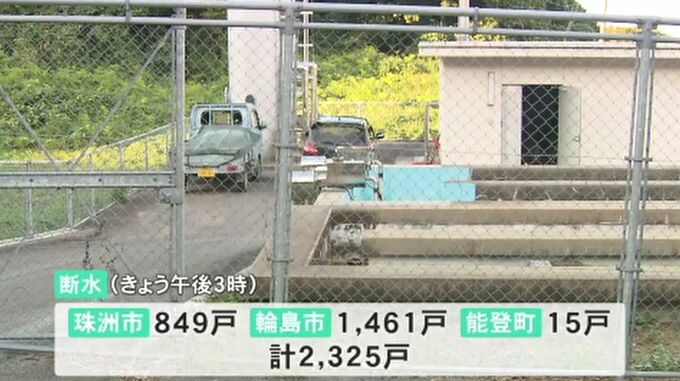 県によりますと、今回の豪雨により1日午後3時の時点で、珠洲市で849戸、輪島市で1461戸、能登町で15戸の合わせて2325戸で断水が続いています。