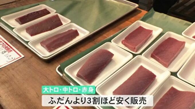 解体したマグロは大トロ・中トロ・赤身に分けられ、普段より3割ほど安く販売されました。