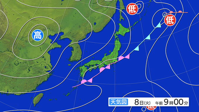 8日午前9時の天気図です。オホーツク海に中心を持つ低気圧から前線が南西諸島にかけて長くのびています。