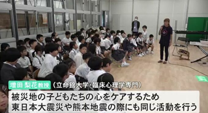 輪島市の河井小学校の仮設校舎で7日開かれた「絵本と音楽のコラボレーション」授業は、立命館大学で臨床心理学を専門とする増田梨花教授が、被災地の子どもたちの心をケアするため、東日本大震災や熊本地震の際にも同じ活動を行ってきました。