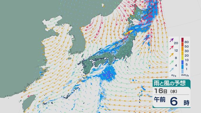 前線が通過する日本海側では、16日(水)の未明から雨が降るところが多いでしょう。東北の日本海側では雨が激しくなり、石川県の能登でも雨が降り続きそうです。