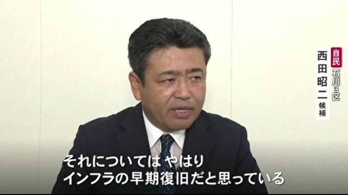 西田昭二候補「やはりインフラの早期復旧だと思っている。能登半島という地域性のハンディキャップを抱えている。そしてまた復興、復旧が遅いと言われている一番の大きな課題についてはインフラである。何においてものと里山海道の本復旧そしてまた高規格でしっかりと整備していくことが先々の能登半島の復旧復興に大きな影響を与えてくるものと思っている。重要施策の一番として進めていきたいと思っている」