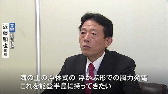近藤和也候補「海の上の浮体式の浮かぶ形での風力発電、これを能登半島に持ってきたい。世界の競争の中で日本、そしてこの能登という場所で作っていくことによって日本の輸出産業にもなるわけだし、日本そのものにとって見ても再生可能エネルギーを増やしていけるということにもなるわけだし、私たちの能登にとっても働く場所ができるということで世界の政策から国策そして地方の政策、求めていることがこの一本でつながる。これを何とかやっていきたいと思う」