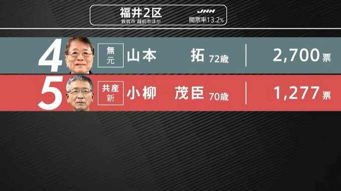 MRO 選挙情報(2025参議院選挙・石川県議補選) 【選挙速報】衆議院選挙 福井2区は立憲・辻英之氏の当選確実 開票状況(開票率13.2%) 2024年10月27日(日) 22:21 福井 衆議院選挙の福井2区は開票が始まりました。 開票率は13.2%ですが、立憲民主党の辻英之さんが当選確実になっています。