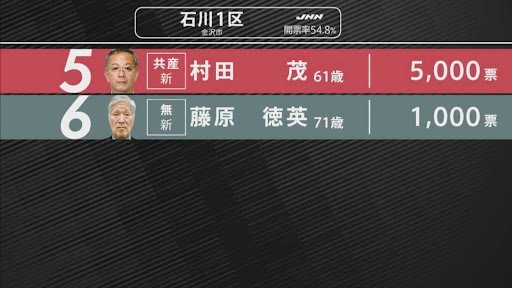 衆議院選挙の石川1区の開票状況です。