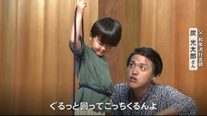 猿引を演じるのは父の炭光太郎さん。金沢で活動する和泉流の狂言師です。そして、大名役は、同じく和泉流狂言師の祖父・炭哲男さん。大名は、サルの毛皮がほしくてサルを猿引に殺させようとします。