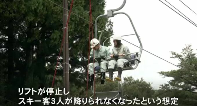 訓練は、リフトが停止し、スキー客3人が降りられなくなったという想定で行われました。