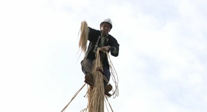 初日は、園内一の枝振りを誇る唐崎松から作業が始まり、庭師ら13人が高さ10メートルを超える芯柱から縄を放射状に投げおろす、「リンゴ吊り」と呼ばれる技法で枝にくくりりつけていきました。