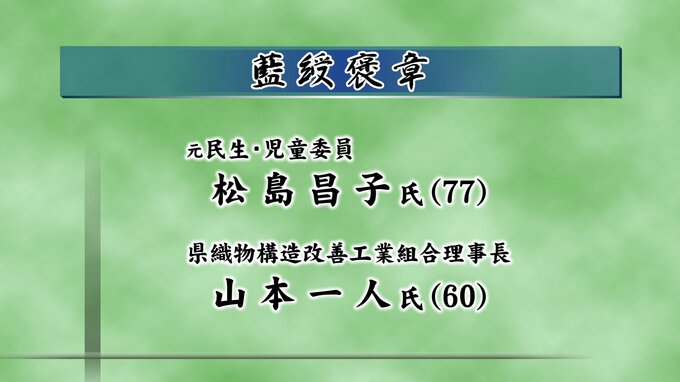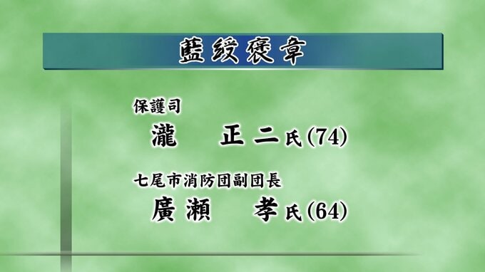 公共の利益に貢献した人に贈られる藍綬褒章は保護司の瀧 正二さん、七尾市消防団副団長 廣瀬 孝さん、元民生・児童委員 松島 昌子さん、県織物構造改善工業組合理事長の山本 一人さんの4人が受章しました。