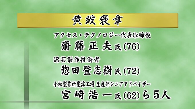 この道一筋に励んだ人に贈られる黄綬褒章にはアクセス・テクノロジー代表取締役 齋藤 正夫さん、漆芸製作技術者 惣田 登志樹さん、小松製作所粟津工場 生産部シニアアドバイザー宮崎 浩一さんら5人が選ばれました。