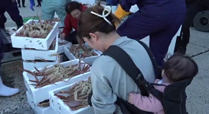 「Qカニ漁のお手伝いは初めて?(背中の赤ちゃん見せて)初めてです。初めて来ました。(夫は)最初はやっぱり気持ち沈んでたんですけど、漁師に対しての支援とかあったりとかでちょっとずつ前向きになってった感じ。やっぱり船に乗ってた方がいいなと思いました」