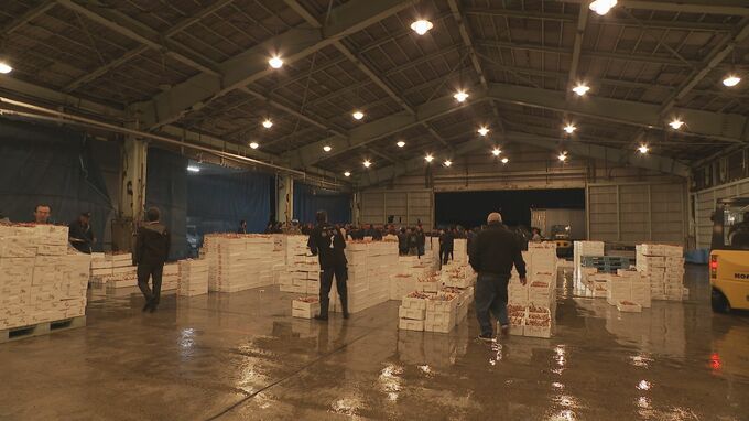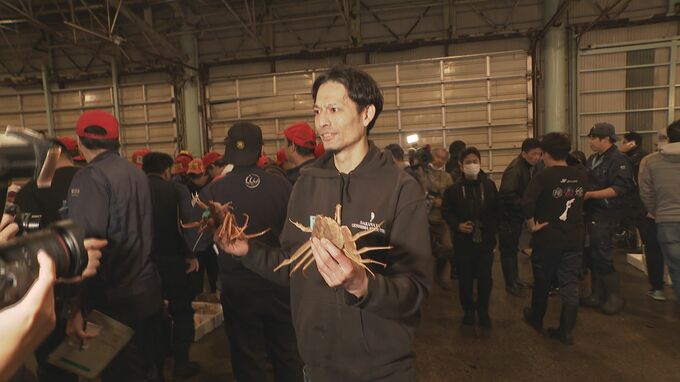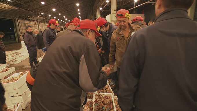 漁の初日は県内であわせて78隻のカニ漁船が漁に出ており、金沢市無量寺町のかなざわ総合市場には金沢港をはじめ地震で港の設備が被害を受けた輪島港からも県産のカニが運び込まれ、競りにかけられました。