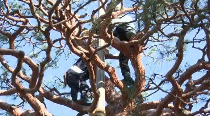 こうした中、小松市の芦城公園では庭師30人余りが冬場の積雪に備え雪吊り作業を行い、高さ10メートルほどある芯柱の上から縄を放射状に投げて結びつけるりんご吊りの技法で枝を整えていました。