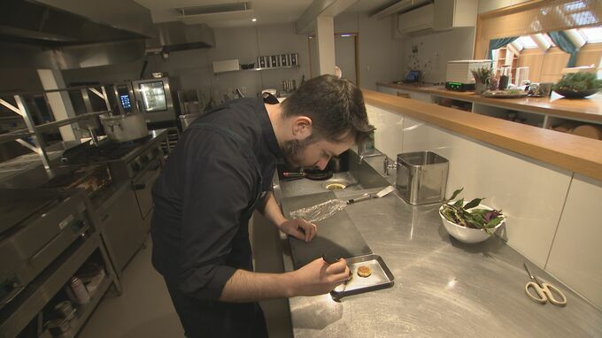金沢市岩出町のフランス料理店「レ・トネル」のシェフ、メキシコ出身のマルコ・サントスコイさんは、カニを使ったタコスなど独創的なメニューを提供します。